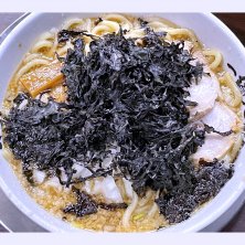 岩のりラーメン 背脂がウリとのことでしたが、普通レベルにしておきました 最大通常の4倍まで背脂追加出来るみたいです スープは煮干しベースで意外とあっさり でも物足りなさはなく、太麺と背脂、スープが程よく絡み合い、岩のりが包み込むような、 そんなお味