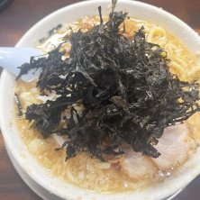 岩のりラーメン。岩のりの香りに満たされながら食べる!麺は太麺。脂の量は調節できる。卓上スパイスの柚子こしょうを追加してさらに良い香りとなった。ここも美味い!