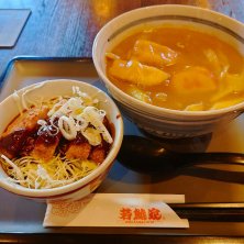 野暮用で豊橋に居ます。 お気に入りのラーメン屋に向かうも、駐車場は満車で行列が出来ていたので勇気ある撤退。 近くのアピタに入って若鯱家。 海老フライカレーうどん+温玉+チーズ。 トロミのあるカレー出汁がうどんに絡みまくり。 これだけでも十分旨いのに、更にチーズと温玉が絡む!! 幸せになれる一杯です(笑)