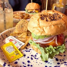 美味しいハンバーガーが食べたいなぁと思い、横浜にないかなと検索。良さそうなお店を発見✨ こんな所にお店あったの?!っていうようなはずれの方にありました。しかし店内は結構賑わってる。皆さん知ってるのね。 チーズバーガーに+250円でスープ、サラダ、ドリンクのセット。 最初にサイドが出てきたけどサラダもスープもなかなか大きい。バーガーも巨大そう…と思ったら予想通り。パティがしっかりしていて、ソースなくても美味しい!付け合せの細いポテトが細すぎて油感…ポテトにかけるソースは美味しかったです。