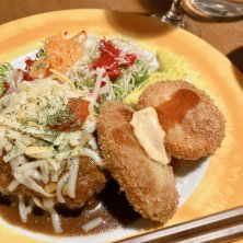 こちらはハンバーグ エスニック風味? クリームコロッケがとろとろでおいしい!