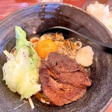 あっさり『海』、こってり『山』、超こってり『狼煙』が三本柱。こってり苦手なんですが今日は暴食したい気分なので『狼煙』いきます! ライスか大盛無料。おじさん、そこまで食べたたくないけど言われちゃ食いますよ。ライスぷりーず。 『狼煙』はまぜそばなんですね。濃厚まったりチョイ辛のタレ。麺は重厚感のある太麺。混ぜそばにしてはトロみのある汁が多めです。追い飯投入するとこってり玉子かけご飯風でうまい!
