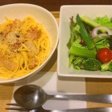 【カルボナーラ】 お客さんが減って、パスタをきっちり時間通りに茹でられる余裕ができてしまったとかで… 以前はなかったメニュー登場です。 自家製のイベリコ豚のパンチェッタ🐷 オリーブオイルで食べるサラダ🌱 美味しかったのでまた次も😙