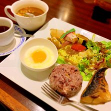 【サラダランチ】 温&冷サラダ、コンソメスープ、チキンクリームシチュー、温泉卵、と、炊き込みご飯90gのなんとなくヘルシーっぽいランチ。焼き野菜のサラダは美味しいですね。わりと満足できました。