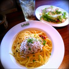 しらすとアンチョビのガーリックオイルパスタのサラダセット。 今日は大盛りにしちゃったよ♪~( ̄ε ̄;) カウンター席はコンセントがあるから、携帯も充電できて助かる♡(笑) 午後も頑張らな!!