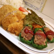 お疲れ様です~☆ 昼飯のたこめしは後輩と分けて食べたから夕方にはもうお腹すいてました(笑) 仕事帰りに久し振りに富士ランチへ足を伸ばしてみました! 前回注文したら品切れでありつけなかったピーマンの肉詰め定食を注文したよ(*^O^*) 厨房を眺めてるとおじさんの調理の手際、おばさんの盛り付けの段取りの良さと見ていて飽きないな。 暫くして僕の注文品が出来上がったようだ。 到着した肉詰めは色鮮やかで良いね!ジューシーでうまいんだな~ケチャップかかってるけど醤油をちょいとかけるとうまし(^^)b