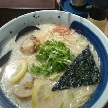 本日の空港飯(夕食)は開高のホタテレモンラーメン。 名前だけ見ると何とも不思議なメニューですが、豚骨ベースのあっさりしたスープにレモンの爽やかさが少し効いた一品で、お好みでレモン汁をかけます。ホタテ旨し(^q^) ラーメン魂というゲームにも具材にレモンがありましたね。