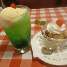ラケル 上大岡店(@^^)/~~~さんですねぇ(笑)☀️😵💦(`Д´≡`Д´)??オムライスが有名ですねぇ(爆)(@^^)/~~~クリームソーダ&プリン🍮です😆🎵🎵マラスカーノチェリー🍒が乗っています。