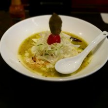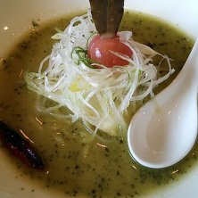 バジルdeグリーン味噌 特盛(麺2倍) ラーメン食べ歩き日帰り旅行2件目(夕飯)は麺 藏藏です。 行き方困ったので先にあげとくと、宇都宮駅から東野バスで氷室まで! まあ車が無難です ここでは、このラーメンと味噌ラーメンをそれぞれ特盛で頼んで、友達とシェアしました。 興味、期待半分で頼んでみたこのラーメンですが、予想以上の美味しさでびっくりしました、 ベースには味噌があり、そこにチーズとバジルの味がしっかり調和。 イタリアンのような材料ですが、しっかりと旨いラーメンとして完成していました。