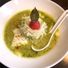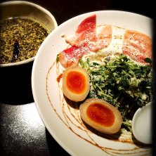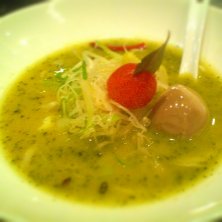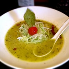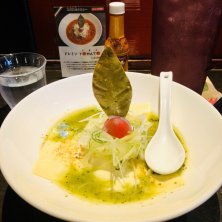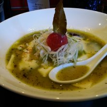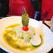 宇都宮市氷室にある麺 蔵蔵(ざざ)サンのバジルdeグリーン味噌です。味噌ベースにバジルのペーストが何とも新しく、とろとろチーズも混ざると更に和と洋の見事なハーモニーが…美味です。