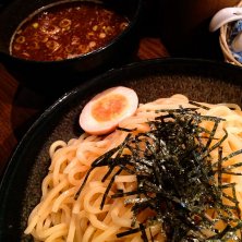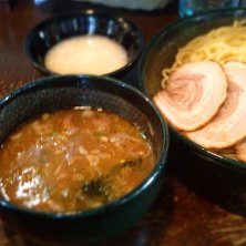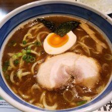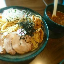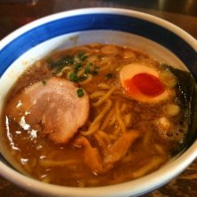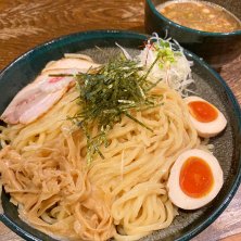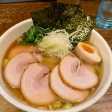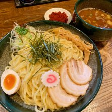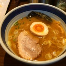 『辛そば(大) 魚介増し』850円 スープは定番と魚介増しから選べる。どんぶりの形が好みじゃないけど、スープが熱々😋 開店すぐに並びができてて、結構な人気店の様子です。