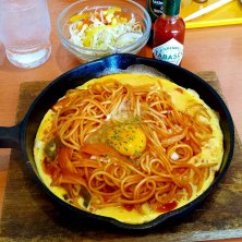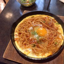 台風で学校が休校になったので、美味しいものを食べに♡♥卵のっけ鉄板ナポリタン!! 卵に絡めながら食べるスパは絶妙~♪ (•罒•* )