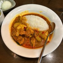 定期的に補給が必要なトプカにて インド風ポークカリー ライス少なめ 1300円 食いしん坊のくせに食が細くなり、トプカのインドポークも辛さを克服したからライス少なめでいただけるようになって。 今日はAM在宅PMオフィスという変則勤務にしたのでトプカへ。 いつメン同僚ちゃんはアロマズには行くけどトプカは辛過ぎるとのことで許可が出ず、一人ランチの日はトプカチャンスなのです🥹