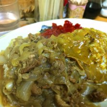 牛八@大井町 スタミナカレー 中 湿気が多くて蒸し暑くてイライラするのと、異常にお腹空いていて、とにかく何かたらふく食べたかったので…また食べちゃいました、これ。昔の学校給食で出ていたような甘口のカレーと、これまた甘めに煮込んだ玉ねぎたっぷりのすき焼き風の炊いたお肉と…中盛でお腹いっぱいです。でも店長さんと話しして次回は2kgに挑戦?