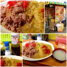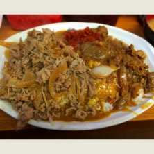 スペシャルカレー。 ボリューム強烈。 牛丼屋の並盛り2杯以上はあろうかという量でした。 スペシャルは豚と牛両方の肉がのってますが、牛肉のほうが旨いかなと。 ここまでいくと味などどうでもいいんですが。 いゃぁ、お腹が苦しい。