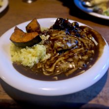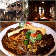 富良野の市街地に構えるカレーの有名店【唯我独尊】に訪問しました。 ログハウス風の店内に入りメニューを一読。自分は《オム+ソーセージカレー》を、連れは《牛タン+ソーセージカレー》を注文しました。 真っ黒なルーを口に含むと先ずはフルーティな甘さが広がり、後からスパイシーな刺激が襲ってきます。色からしてまったり系かと思いきや、スッキリとしたキレのある仕上がりとなってます。 自家製ソーセージは、溢れる肉汁と重厚なお肉感。私史上最高ランクの美味さのソーセージ。