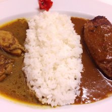 たくさんあるカレーメニューの中から2種類を選んで2色カレーに(^o^)/ 右側ハンバーグ、左側ムルギー。 ハンバーグは手作りでジューシー。 ムルギーはスパイスが効いてチキンが柔らか。 たまりません*\(^o^)/*