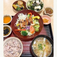 大戸屋ランチ もろみチキンと彩りサラダボールとしそひじきご飯 いろいろ茸となめこ汁 小鉢はシェアで ひんやり豆腐サラダ ミニ野菜の黒酢あん 旦那と所用をすませて、遅めのランチだったので あれもこれもと頼みすぎました😅