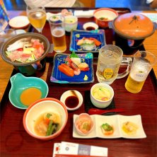 1日の夜。一泊二食付きで¥7700 お風呂は天然温泉ではなく、光明石を使った有効ミネラル成分泉なので、物足りないけど、湯が優しく、それなりに効能もあり、温まりました。夜中に露天風呂に入ったけど、小雨がポツッポツッといった程度。 ニュースでは、大荒れの地域があるというのに、北海道は広いですね。 翌朝目覚めた7時は快晴で爽やかな朝。あれ?どうなってんだ?と出発の8時に雨と突風が吹いてきました。9時に旭川に着く頃は落ち着いてきて、商談の終わった11時には晴れ間が覗いて来ました。普通に東京に戻れました。