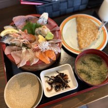 エビマヨ アジフライ 厚切りロースかつ(300㌘) お刺身定食 ご馳走さまでした(´V`)♪