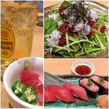秋田県秋田市 さかなや道場 秋田駅前店 ハイボール+水菜と大根のさっぱり梅サラダ+まぐろ三昧 にぎり寿司 時間が無かった所でサクッと飲み直しと腹ごしらえ。 シャキシャキの大根と水菜のサラダに梅のソースがさっぱりし、意外にもハイボールに合う。 寿司は赤身が二種と中トロにねぎとろ、食べた寿司一貫毎をリセットしつつ、もう一杯ハイボールをオーダー。 最終電車にギリギリ乗り、帰路は爆睡…。