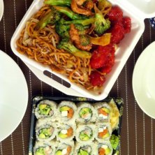 11/27 今晩の二人ごはん☆近くのモールでテイクアウト!スイートサワーチキン、ブロッコリーとチキンの炒め物、焼きそば、フィラデルフィアロール、ボストンロール!写真の反転ってどうやるんですか??
