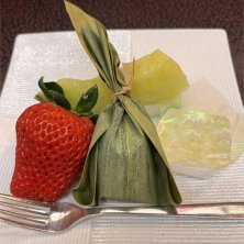 【年末旅行】 旅館夕食のデザートのひと品 メロン、イチゴ、洋梨ゼリー、葛餅 イチゴは紅ほっぺ、大きくて甘い地元のものでした。最高!