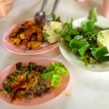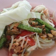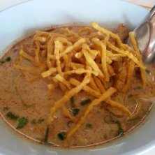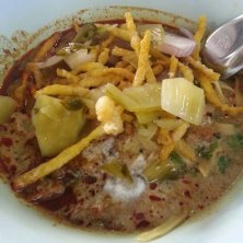 で、お目当てのカオソーイ。 私のはチキンで。夫はビーフで。ビーフは良く煮込んであって柔らかい♡お肉によってスープが変えてあるみたいで、チキンの方がまろやかでした。ココナッツミルクが多めみたい。 そこにエシャロットやお漬物、レモンを絞って食べます。 全部辛いのだったから、唇がスパイシーです!笑 でも、本場のカオソーイ美味しかった!これからあと3日で、嫌ってほどカオソーイ食べたい!