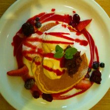 黒蜜珈琲クリームとチョコアイスのパンケーキ♪ 人生初パンケーキです★ 和風のパンケーキでサックリ生地にしつこくない珈琲クリームとチョコアイス 牛肥と黒豆とはちみつの相性が最高(*≧∀≦*)