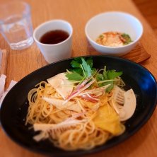 筍と湯葉の'こななのくろ'風味みょうが添え 自家製豆腐きのこあんかけ あったかいほうじ茶 こななの和パスタランチー♡ バイト先で初お一人様でした。 でも店員さん優しくて、全然苦にならなかった!これからはお一人様怖くないかも!? お出汁のパスタは…うーん、パスタはもうちょっと濃いソースのほうがいいかな(^^;) でもあっさり美味しかった!