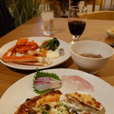 温泉にやってきました。 カニ足や若狭牛のなんたら(料理名忘れました)