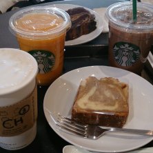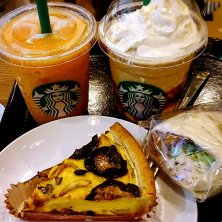 今日はイオンにお買い物♪(*^^*) 三連休の真ん中なのでいつもより更に人が多い(;´д`)少しスタバで休憩☆ マンゴーパッションティーフラペチーノ、キャラメル&プディングフラペチーノ(名前長いっ!(笑))根菜チキンのサラダデイップ、なすとキノコのキッシュ♪底にはプリン…甘くて美味しい♪生き返った(*´ω`*)