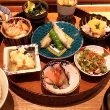 小鉢膳ランチ 土鍋ご飯と日替わりの8品の小鉢 お味噌汁お漬物が付き プラス、今日は食前に日本酒、梅酒、梅ジュースのどれか1つと抹茶のムースがついてきました♪ お正月Ver.なのかな? 今日の土鍋ご飯はつや姫♪ おかわりも出来ます。 今日の小鉢(上から時計回り) ・ホタテとイクラの松前風 ・鴨ロースト金柑添え ・かぶら蒸し カニあんかけ ・子持ち昆布 ・ブリの七味風味 ・海老しんじょうの酒粕汁仕立て ・マグロの胡麻醤油付け (真ん中) ・和牛カツレツと菜の花のフリット ご馳走さま~♥