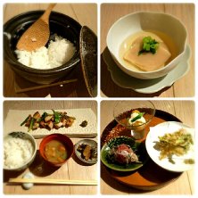 ◆夜の土鍋ごはんセット◆ ~白いご飯から広がる豊かな生活~をコンセプトとしたAKOMEYA TOKYOが運営するお食事処。 取り扱い食品や調味料や器が使われています。 こだわりの逸品が探せるので時々ショップを利用していますが、初めてお食事をいただきました。 前菜三品(お造り、サラダ仕立て、フリット)と主菜(鶏の塩焼き山菜添えを選択)に土鍋ごはんのセット。 ご飯は日によってお米が変わるそうで、この日は山形のつや姫でした。 余ったらおにぎりにして持ち帰り可能♪ やっぱり白いご飯は最高のご馳走!