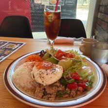 4月29日のお昼は歩いてたら流れてきたいい匂いにつられて入ったハンバーガーのお店 チーズバーガーにしました セットはポテトかサラダか選べたのでサラダに こういうボリュームあるハンバーガーを食べ慣れてないので上手く食べられるか心配でしたがなんとかこぼすこともなく食べられました
