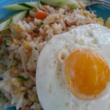 カオパッド クン、海老炒飯。半熟玉子焼き付き。炒飯には、半熟玉子野球が欠かせません。とろりと溶けた玉子とご飯を混ぜると、ウマウマになります。ご飯のサラサラ感に海老の香りも、goodです。