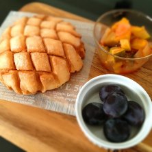 朝ごはん。メロンパン、ラタトゥイユ、巨峰。 最近体力づくりのためフィットネスに通い始めました。今日も泳いできます(*^_^*) せっかくの休日に夫に子供たちを任せるのが申し訳ないけど…育休中限定なのでよろしくね♡