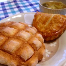 あさごはん、近くに新しくできたベーカリーのメロンパンとアップルパイ、コンソメ野菜スープ。どちらも一晩おいてもおいしい!アップルパイは甘酸っぱくて好みです。野菜スープも鉄板。朝から幸せd(^_^o)