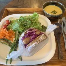 5日昼食*はんなさんのコンプレパンドッグ紫キャベツ入り♡グリーンサラダ♤キャロットラペ♢焼万願寺♧南瓜スープ お店の持ち主さんは「かぜのね」ですがシェアキッチンなのでこの日は「Chi’s082」さんの営業日。