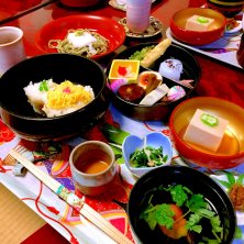 連投Part⑦ お待ちかねの昼食は精進料理の山菜つづり 琴をいただきました☆ 山菜五目ちらし,刺身こんにゃく,ぜんまい,高野豆腐,きゃらぶきの佃煮,手毬麩,なす田楽(ゆず味噌),たらの芽の天ぷら,葉わさびの醤油漬け,萩の蒲鉾,じゃがいもの酢の物,味玉子,笹そばの山芋かけ,胡麻豆腐,香の物,お吸い物,人参ゼリーを先程の庭園を眺めながらいただきました(*^^*) どれもヘルシーで美味しかったですよ♬ 連投終了です‼︎ 失礼しましたm(_ _)m