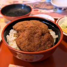 「パリ丼」 敦賀の名店、ヨーロッパ軒の名物メニューのひとつです。 ソースカツ丼がNo.1ですが、おじさんには少々辛いのでメンチカツのパリ丼にしました。 それにしてもご飯の量が多い! 次はミニにします。
