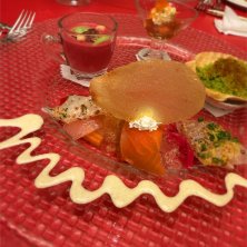 デザート盛り合わせ バラのジュレとかマンゴーのジェラートとか。 はのジュレがさっぱりしてて美味しかった。