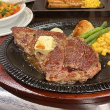 ロースステーキ お肉続いているけど食べに行きました♡ 今回のスープはクラムチャウダーにして メキシカンサラダ🥗は一皿づつ あとチョリソー😊 前回のサーロインよりやっぱりいつものロースの方が美味しかったです