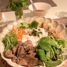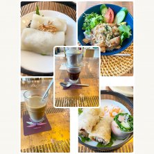 友人とたまにはランチ🍽 ヴェトナム料理にしましょ😃 いろいろありましたが、ブンチャーを。 揚げ春巻きやらなんやらついてきましたが、このセットは揚げ春巻きがお皿の方に付くので本来ならないはず(^^; 間違えたそうで、そのままいただきました✌️ ま、揚げ春巻きが増えただけなんですが😅 半分食べ散らかしたところで📸 本来はメニューのようなお皿のはずでした😂 食後には練乳入りのヴェトナムコーヒー☕️を。 美味しゅうございました😋