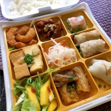 彩り弁当、930円。 *生春巻き *揚げ春巻き *蒸し春巻き *厚揚げレモングラス *牛スジ煮込み *鶏のレモングラス焼き *エビフライ *なます *マンゴーサラダ *ご飯 温かい料理は作りたて。 素晴らしいですなぁ。旨い😄