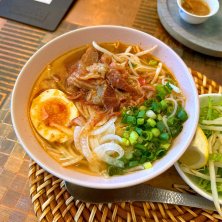 (前postより続き) そして、ブン・ボー・フェ!(牛すじ肉入り辛口スープビーフン麺) 一緒についてきたもやしとレタスは…これはどうするのが正解か分からずスープに入れて食べたのですが、合ってますかね?教えて偉い人! グリーンカレーもあったのですがイカが入っているとか…イカは好きなのに体質に合わず食べられないのでブン・ボー・フェにしたけど、満足度高かったのでこれにして正解!