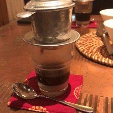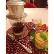 ベトナムコーヒーとデザートの盛り合わせ 手前:マンゴープリン まるでバナナのように甘い❗️ 真ん中:苺のチェー 奥:あずきのチェー ベトナムコーヒーは練乳と混ぜていただくのです。 これ美味しいよ‼️ ベトナム料理イイね❗️