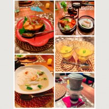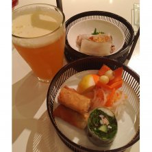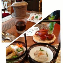 春巻き3種(蒸し、揚げ、生) ブンリュウ(トマトとカニのビーフン) コーヒーと小豆のチェーのセットに追加で揚げバナナ〜