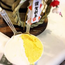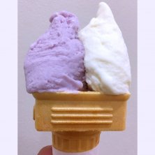 神奈川県横浜市西区 相鉄ジョイナスの地下街にあるアイスクリームの店、伊太利亜(いたりあ)のじゃらあとやのジェラート、むらさきいも(左)と、とうふ(右)。 ダブルコーンというコーンに、好きなジェラートが2種類選ぶ事が出来る物を買って食べました。