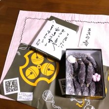 【をさの音】 機織りに使う糸巻きの形を模した、小倉餡のお菓子です。糸巻きの芯になっているのは、ごぼうです。箱の中に、がさっと入っている感じが、本当の糸巻きの箱を開けた時みたいで、いかにも道具っぽい。梅花の落雁が、春遠からじ…の趣です。 いよいよ今月末迄の営業です。 昨夜、友人が届けてくれました🎁